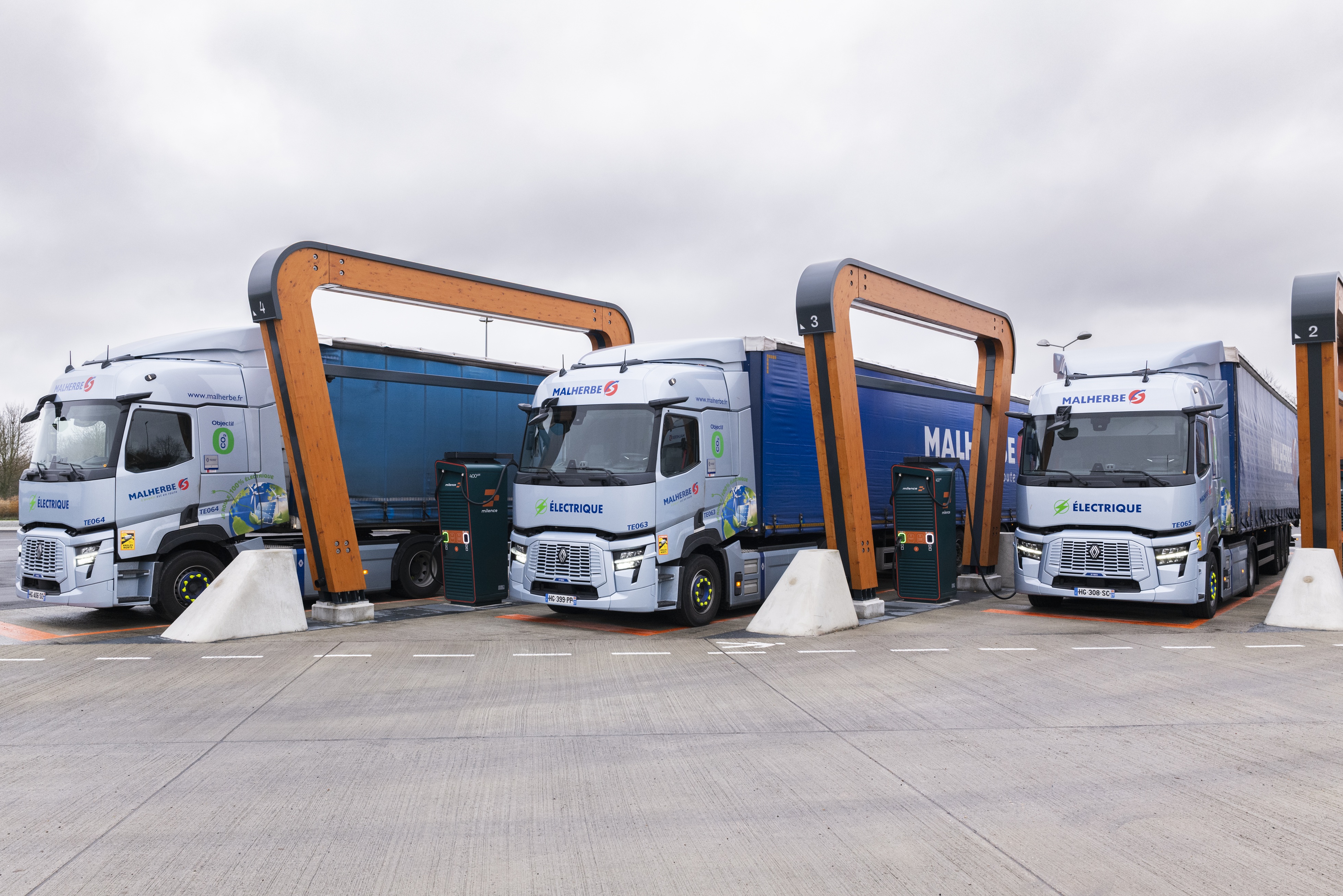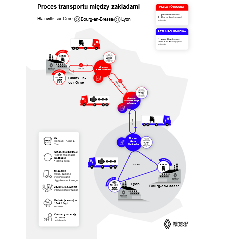 - Ciężarówki elektryczne wyjeżdżają z bazy Malherbe w Vironvay i dostarczają silniki oraz osie z fabryk w Lyonie do fabryki Renault Trucks w Blainville-sur-Orne.